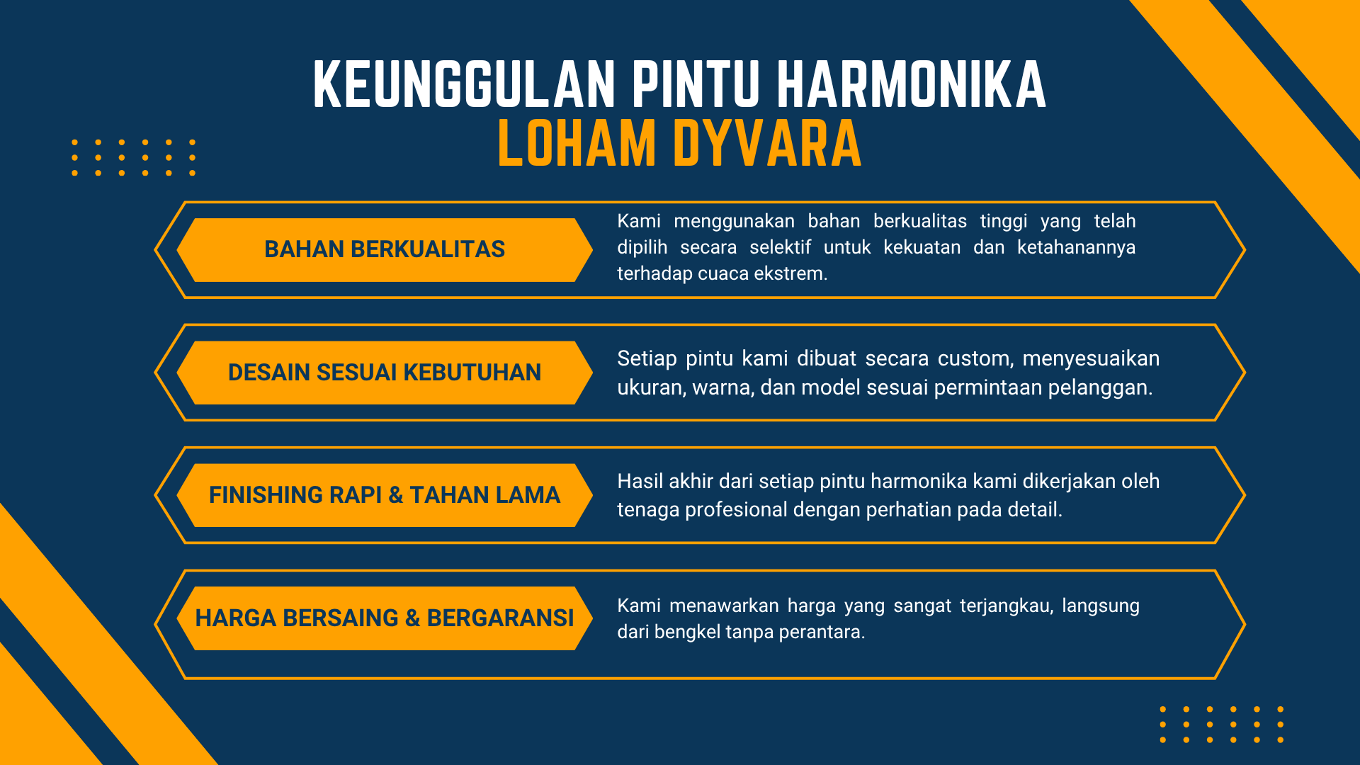 Loham Dyvara Harmonika adalah perusahaan yang bergerak di bidang jasa pembuatan pintu harmonika dengan harga murah per meter. Kami menomor satukan kualitas, kenyamanan dan kekuatan jangka panjang. Material dengan kualitas terbaik didukung dengan tenaga ahli yang sudah profesional dibidangnya menjadikan pintu harmonika yang kami produksi bisa tahan hingga puluhan tahun. Kami menyediakan banyak pilihan model dengan hasil yang sangat rapi, tentunya dengan harga yang sangat terjangkau.